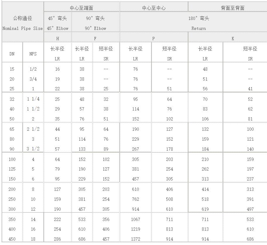 1、常用的彎頭的為長半徑系列,中徑的彎曲半徑為公稱直徑的1.5倍(公稱直徑小于25時為38mm)
